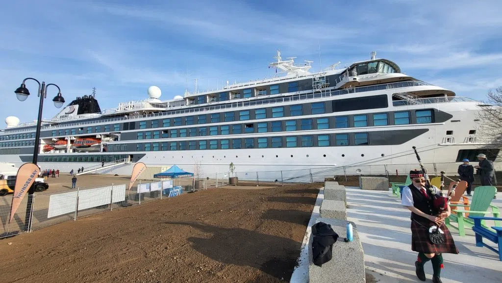 A bagpiper welcomes guests and crew of the Viking Octantis to Thunder Bay on May 25th 2023 (Adam Riley / Acadia Broadcasting)