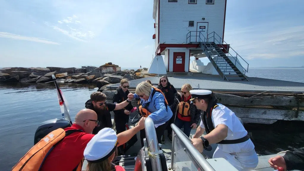 United Way of Thunder Bay CEO Albert Brulé assists in a rescue during a media event for 'The Great Lighthouse Rescue' in 2023