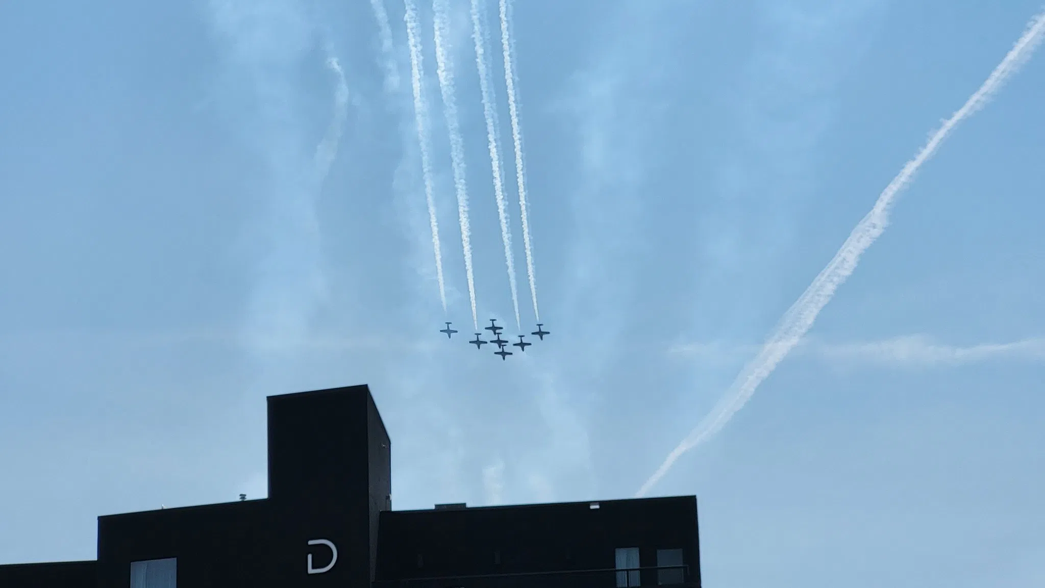 Multiple flybys of the Snowbirds in their CT-114 Tutors could be seen by residents in the Waterfront area. (Adam Riley Acadia Broadcasting)