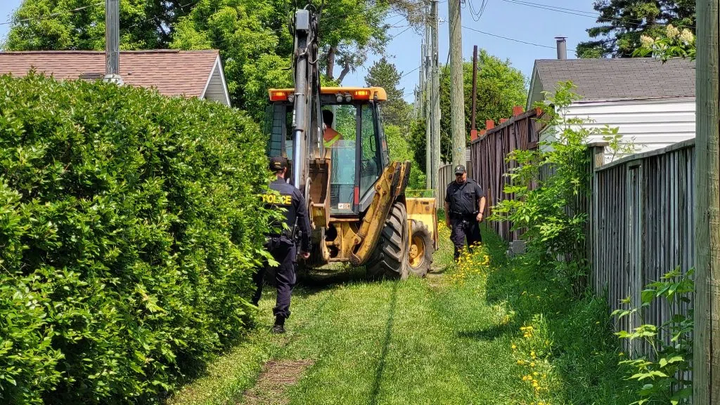 A backhoe is brought in to assist police as they confirm no other explosives are in the area. (Adam Riley / Acadia Broadcasting)
