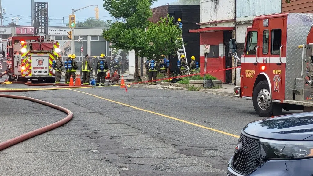 Crews work to suppress any hot spots at a former Simpson Street bakery Sunday evening (Adam Riley / Acadia Broadcasting)