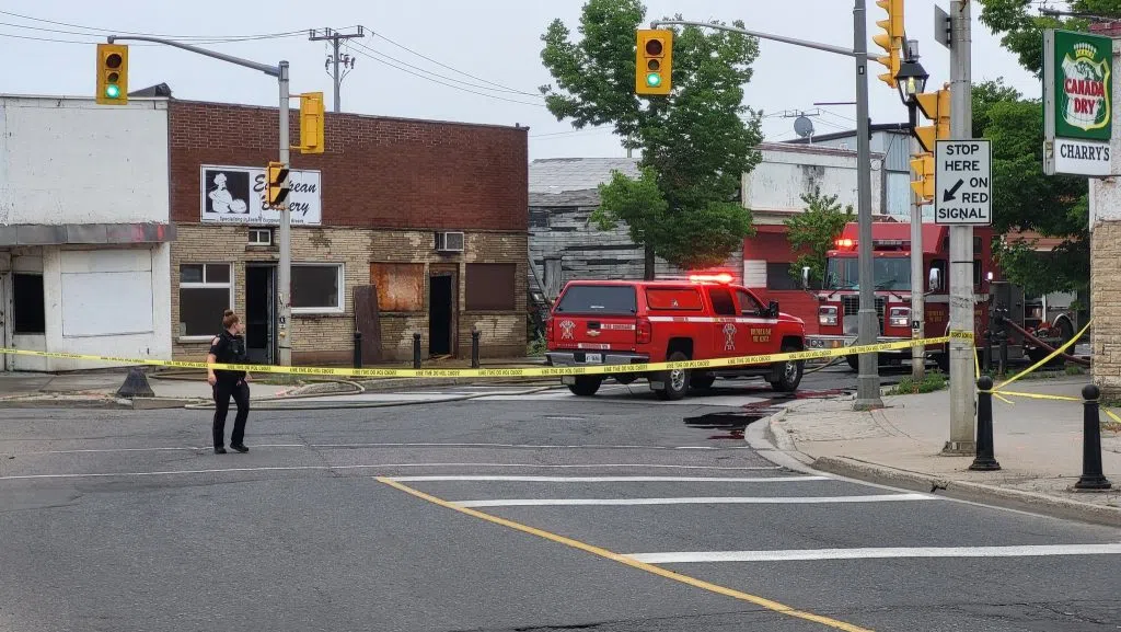 A section of Simpson Street was closed to traffic Sunday evening following a fire at the former European Bakery (Adam Riley / Acadia Broadcasting)