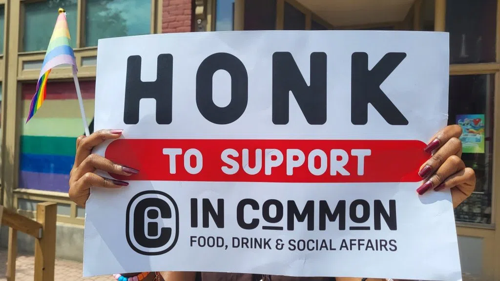 One of several signs being held as supporters of In Common rally Friday afternoon (Adam Riley / Acadia Broadcasting)