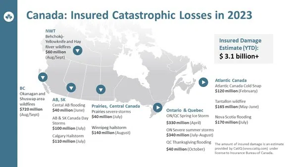 Canada reached $3.1 billion in insured damage from those events, according to Catastrophe Indices and Quantification Inc. (CatIQ).