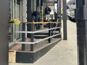 Workers are pictured installing the patio at the Obladee Wine Bar in Halifax on June 18, 2025. (Jacob Moore/Acadia Broadcasting)