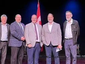 (left to right) Greg Shay (Yarmouth International Airport Corp. CEO), Yarmouth MLA Nick Hilton, Acadie-Annapolis MP Chris d’Entremont, Neil MacKenzie (Yarmouth and Acadian Shores Tourism Association CEO), Mitch Bonnar (President, Th’YARC) (Acadia News)