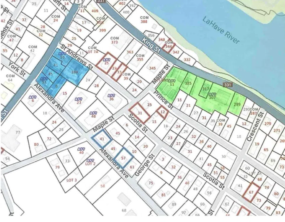 The properties shown in blue and green are part of the 82 housing units that for which SSODA has entered a purchase agreement. Photo: SSODA/Town of Bridgewater.