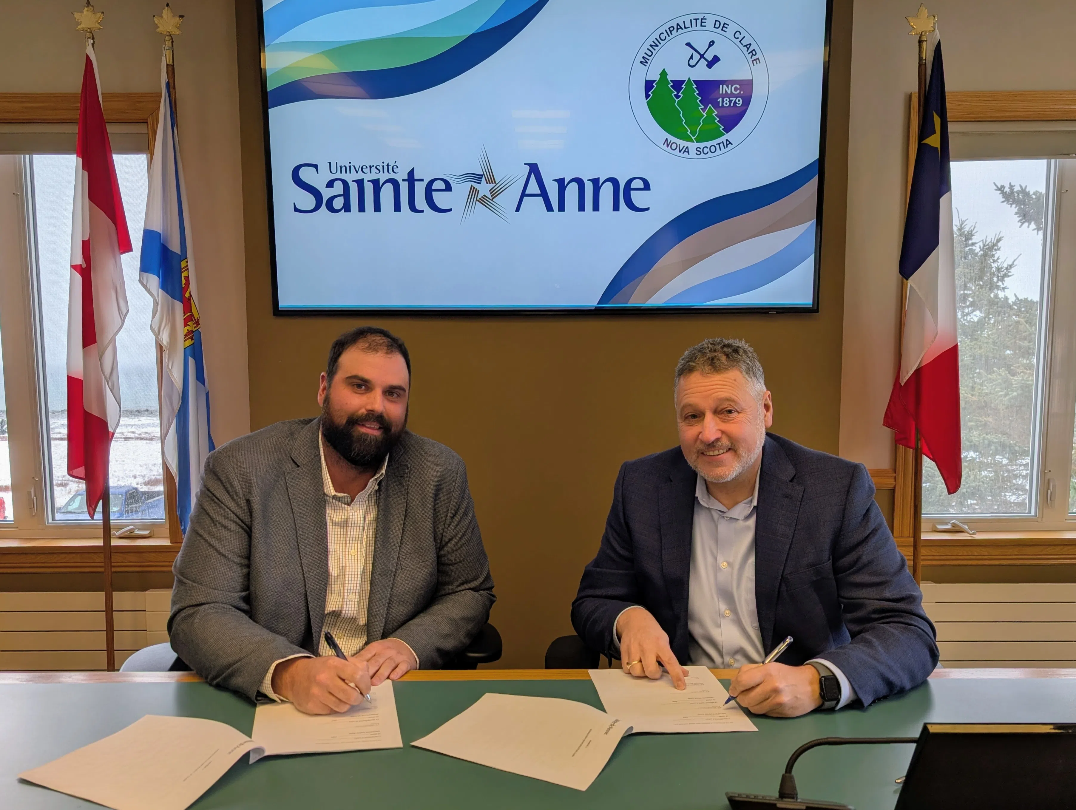 Clare and Universite Sainte-Anne announcing the collaboration agreement.