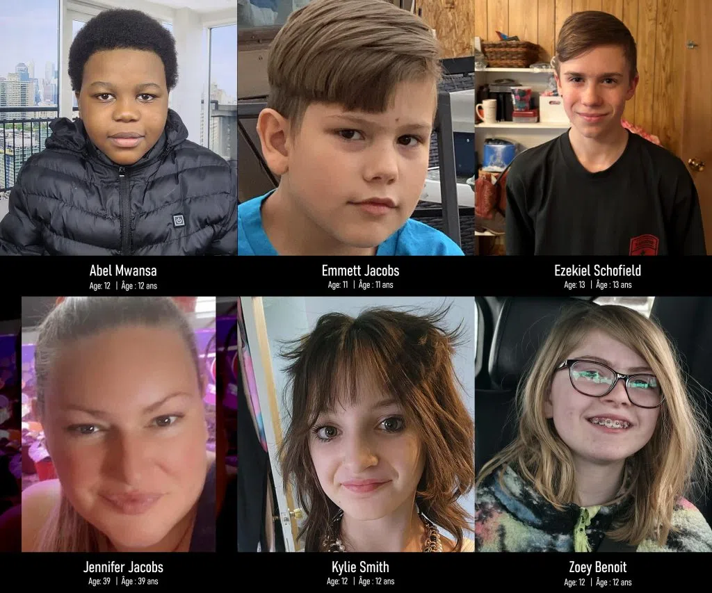 Abel Mwansa, 12; Emmett Jacobs, 11; Ezekiel Schofield, 13; Jennifer Jacobs, 39; Kylie Smith, 12; and Zoey Benoit, 12, are shown in this handout image. The six are among those killed in the Feb. 10, 2026 mass shooting in Tumbler Ridge, B.C. Photo: RCMP.