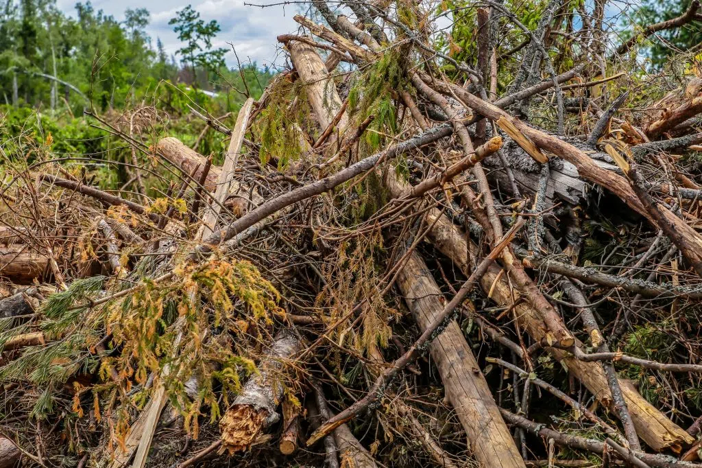Attachment: bunch dry old branches trunk spruce impassable blockage cleaning the forest bad weather