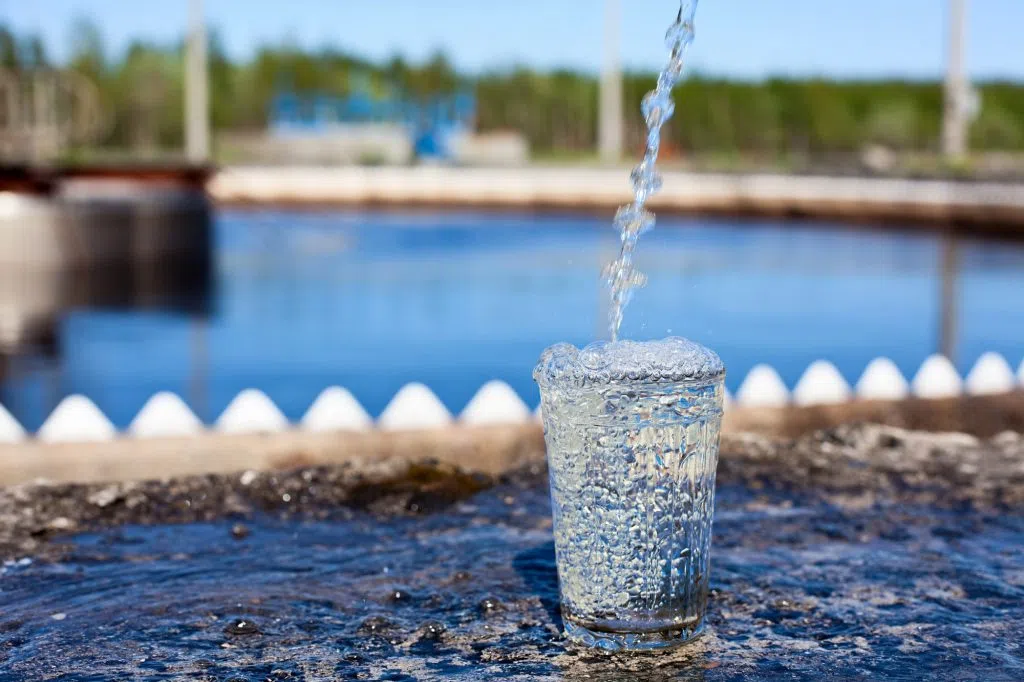 Clean water pouring into glass standing on the water treatment setler