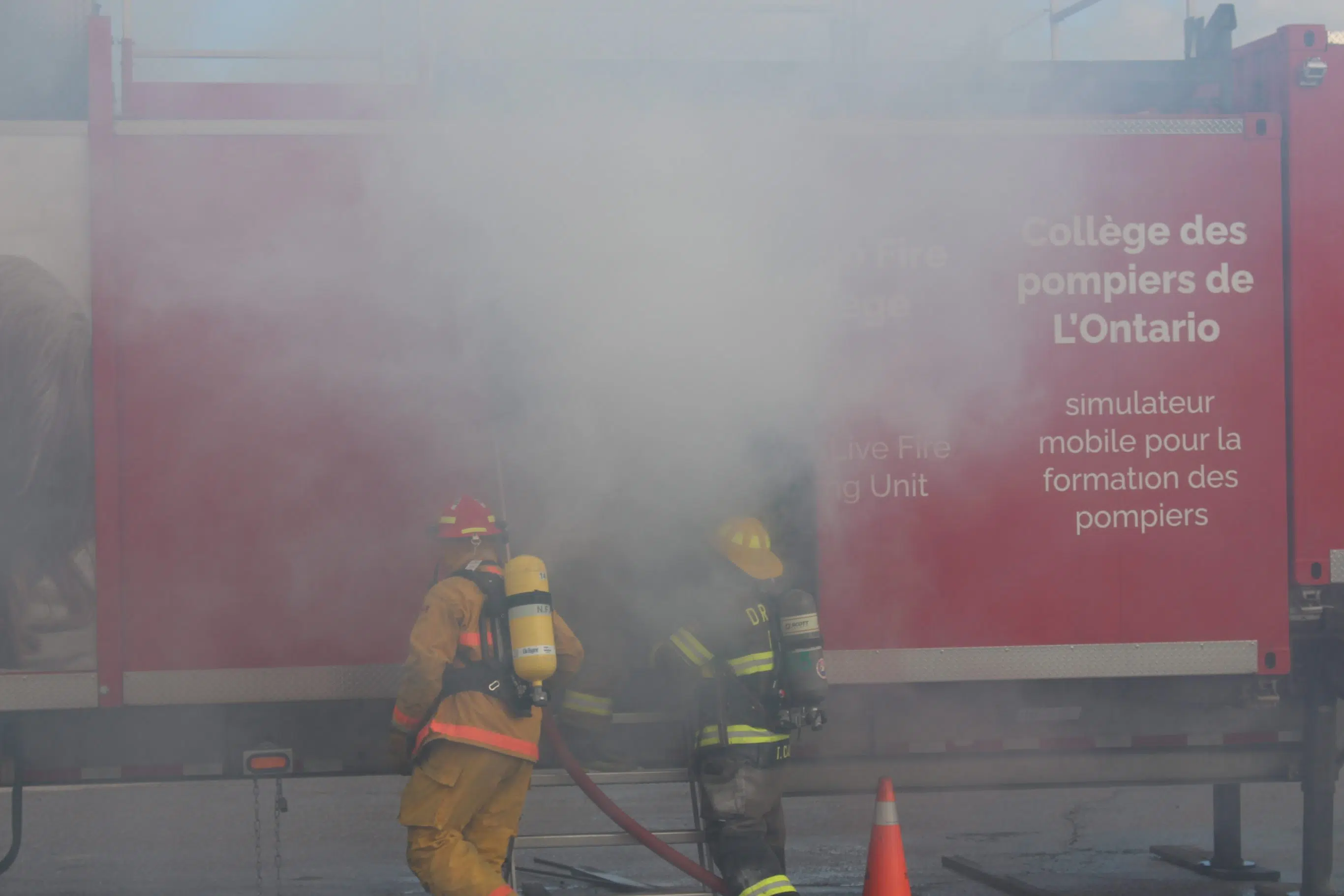 Smoke billows from a simulated fire which helps prepare fire fighters for situations they may face on calls (Adam Riley / Acadia Broadcasting)
