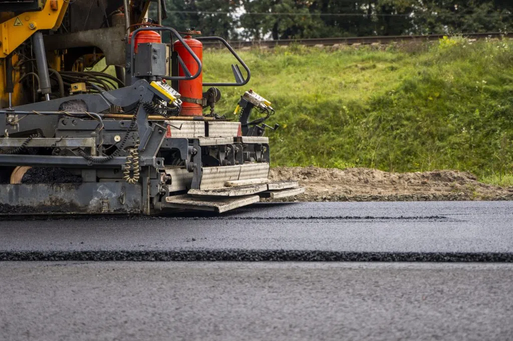 Industrial asphalt paver machine laying fresh asphalt on road construction site
