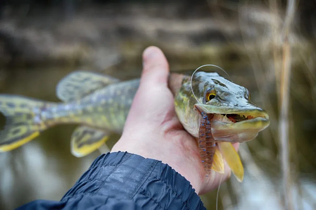 Attachment: Pickerel (pike fish) in hand with the soft bait in jaws. Fishing on wild river, lake.