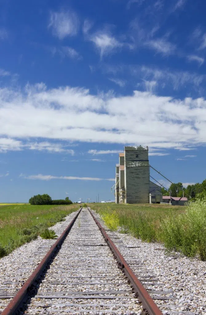 Train tracks leading to three grain elevators in Mossleigh Alberta on a summer day