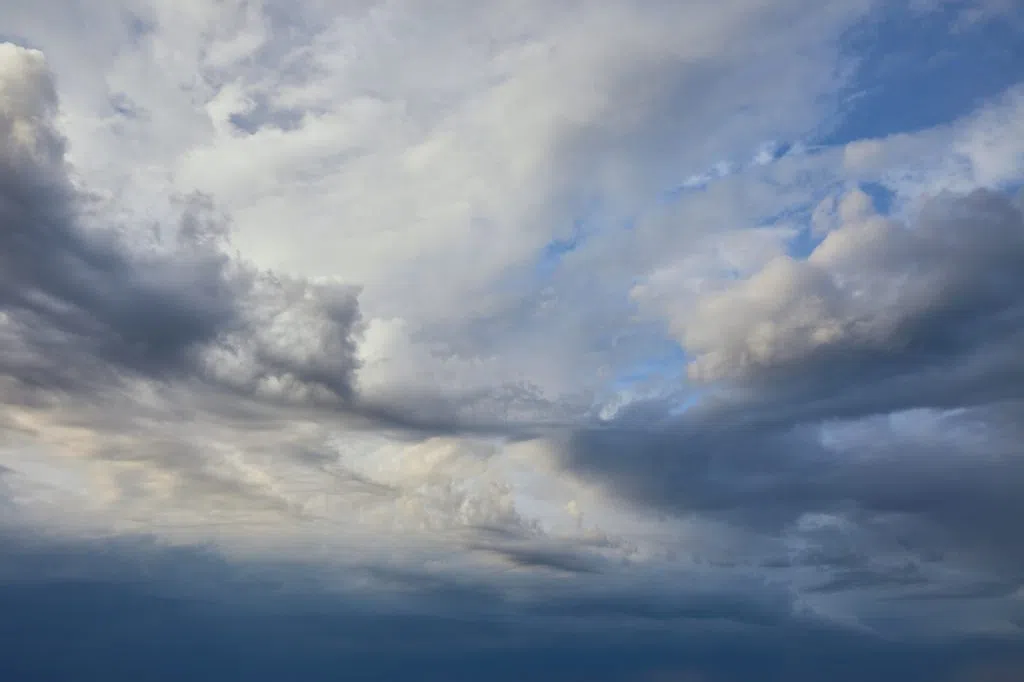 View of peaceful grey sky background with white and dark clouds