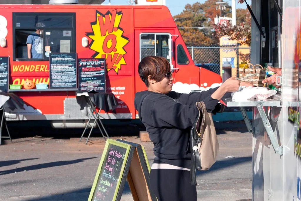 Atlanta, GA - November 17, 2012: An unidentified customer buys food from a high-end food truck at the Atlanta Food Truck Park.